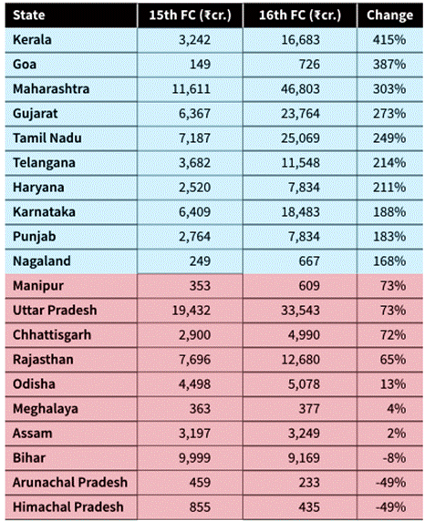 - Kerala recorded >400% increase in allocation, reflecting demographic and urban governance indicators; suggests performance-sensitive distribution.