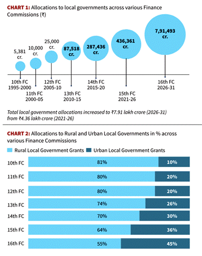 - Commission recommended ₹3.5 lakh crore for Urban Local Governments (ULGs) over five years, reflecting unprecedented scale-up in urban fiscal support amid rapid urbanisation and infrastructure stress.