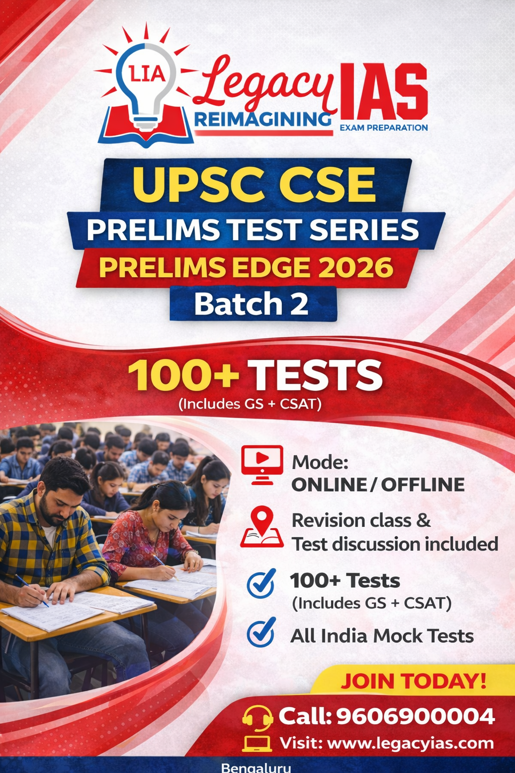 Prelims Edge 2026 is Legacy IAS Academy’s most comprehensive and exam-oriented UPSC CSE Prelims Test Series, designed to simulate the real UPSC environment while ensuring systematic revision, concept clarity, and performance improvement. This program is ideal for aspirants aiming to maximize accuracy, manage time efficiently, and build confidence before the Prelims 2026 examination.
